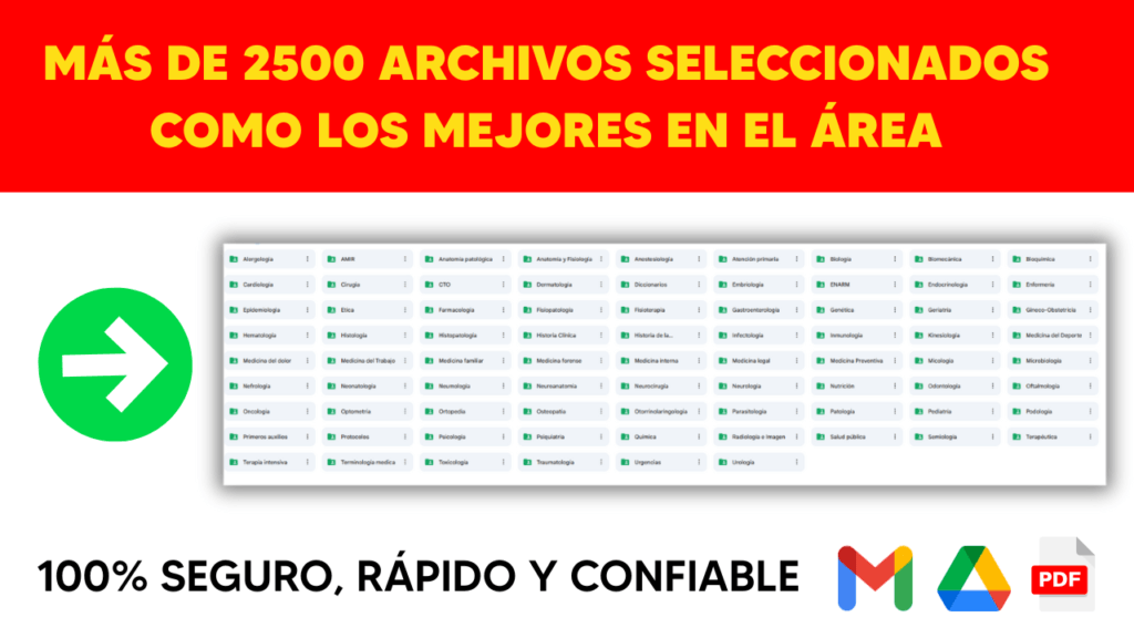 Un archivo en PDF con mas de 2500 archivos de más de 70 especialidades para estudiantes y profesionistas del área de la salud .